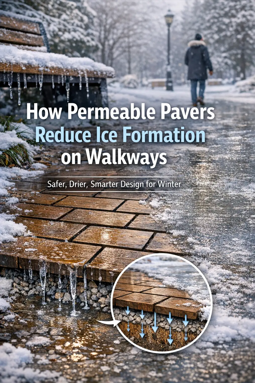Permeable pavers offer a fundamentally different approach to winter safety. Instead of fighting ice with salt, chemicals, and constant maintenance, they reduce ice formation at its source: standing water.