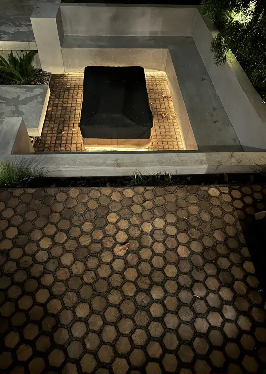 Wood-based permeable pavers are particularly effective in these spaces because they visually enhance the atmosphere. Around a fire, people instinctively respond to natural textures. Wood reflects warmth and complements the organic glow of flames. Instead of a grey slab interrupting the landscape, the ground itself becomes part of the experience.